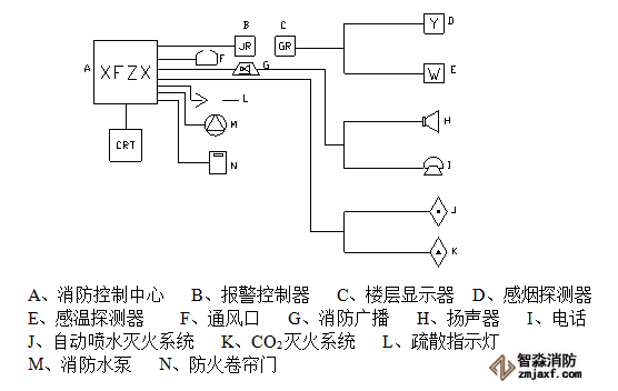 由各類探測器來監測環境的火災情況,一旦有火災發生,由探測器將信息傳送給報警控制器并報警,然后由報警器將信息傳送給CRT,并對信息進行確認,發出報警信號,將信息傳送給控制中心。控制中心再次確認后,切斷(一般使用)電源,打開應急照明和疏散指示燈,打開排煙風機,向控制區域內廣播火災信息,引導人員疏散,并將信息傳送到有關部門,啟動消防泵,啟動防火卷簾和防火門,關閉防火閥,將火災區域予以分隔,啟動滅火系統,對火災區域實施滅火。