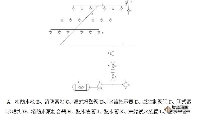 自動噴水滅火系統由水源、加壓送水、報警閥、管網噴頭以及火災探測系統等組成。本自動噴水滅火系統屬于濕式自動噴水滅火系統。其結構如下圖: