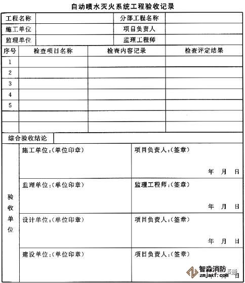 2、自動噴水滅火系統工程驗收應按自動噴水滅火系統工程驗收記錄表填寫。