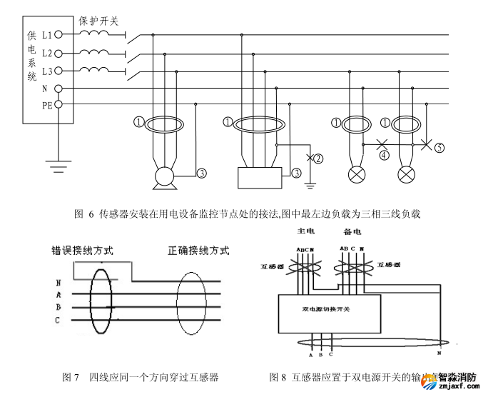 2) 每個監控點處凡不通過負荷電流的電纜 PE 或 PEN不得穿過傳感器,應如下圖中標③處所示。