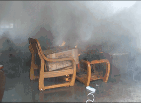 (實驗畫面顯示,火災發生后,獨立感煙探測器開始報警,簡易噴淋開始噴水)