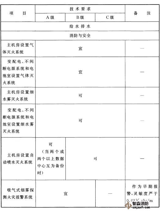 1、數據中心防火和滅火系統設計應符合現行國家標準《建筑設計防火規范》GB 50016、《氣體滅火系統設計規范》GB 50370、《細水霧滅火系統技術規范》GB 50898和《自動噴水滅火系統設計規范》GB 50084的規定,并應按下表1的技術要求執行。