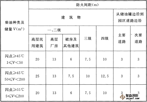 7、當單罐柴油容量不大于50m³,總柴油儲量不大于200m³時,直埋地下的臥式柴油儲罐與建筑物和園區道路之間的最小防火間距除應符合下表5的規定外,并應符合現行國家標準《建筑設計防火規范》GB 50016、《汽車加油加氣站設計與施工規范》GB 50156和《石油化工企業設計防火規范》GB 50160的有關規定。