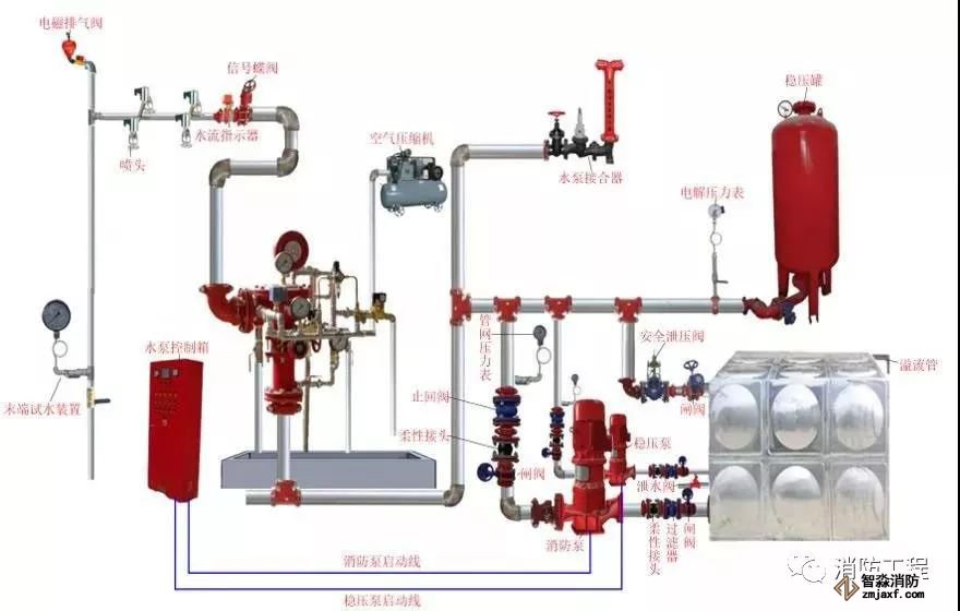 預作用系統在準工作狀態時配水管道內不充水,由火災自動報警器自動開啟預作用閥后,轉換為濕式系統,預作用系統由閉式噴頭、預作用閥組、充氣設備(不是必須有)、水流報警裝置、供水設施及供水配水管道等組成。