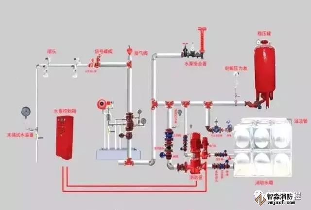 (1)消防給水基礎設施:包括消防水池、消防水泵、消防水箱、增壓穩壓設備等。該設施的主要任務是為系統儲存并提供滅火用水。