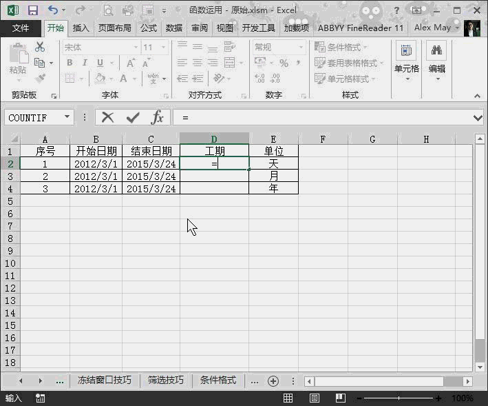 筆者先簡單解釋下以下表格中的單元格D2輸入的公式“=DATEDIF(B2,C2,"d")“前兩個參數分別是開始日期和結束日期,第三個參數"d"是計算天數的參數,也可以改成"m"(計算月份)和"y"(計算年份)。