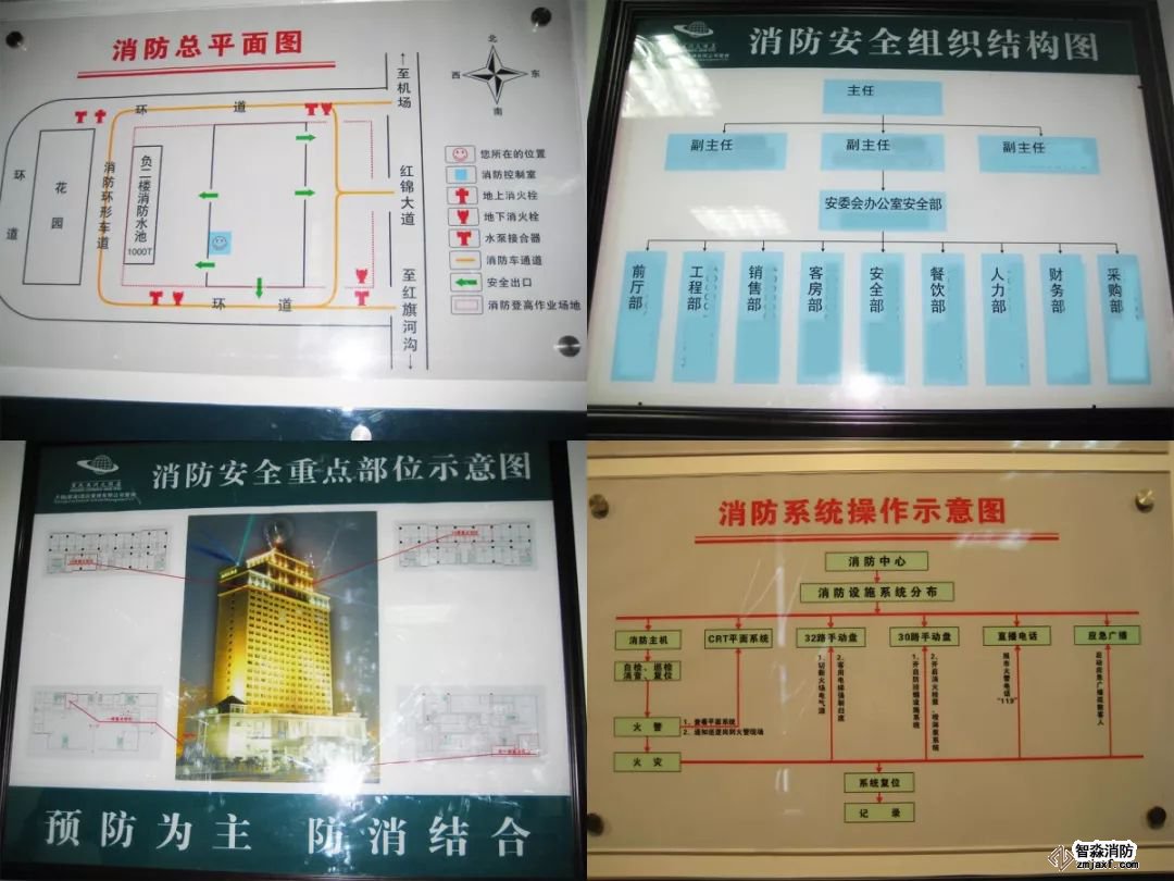 建筑消防總平面布局圖、消防安全組織機(jī)構(gòu)圖、消防系統(tǒng)操作流程示意圖、消防安全重點(diǎn)部位示意圖。