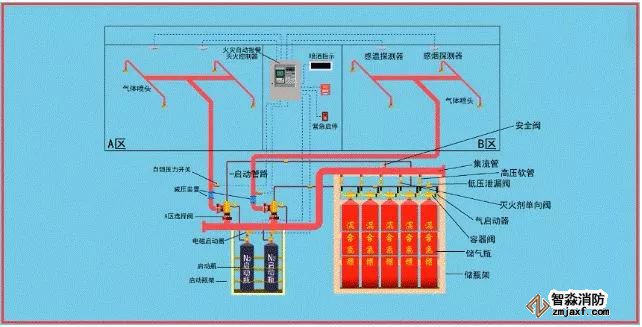 該系統(tǒng)由滅火劑瓶組、加壓氣體瓶組、驅(qū)動(dòng)氣體瓶組(可選)、單向閥、選擇閥、減壓裝置、驅(qū)動(dòng)裝置、集流管、連接管、噴頭、信號(hào)反饋裝置、安全泄放裝置、控制盤、檢漏裝置、管道管件及吊鉤支架等組成。