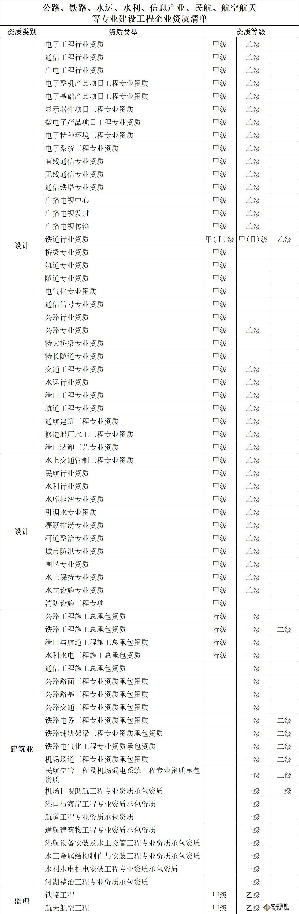 附件:公路、鐵路、水運(yùn)、水利、信息產(chǎn)業(yè)、民航、航空航天等專(zhuān)業(yè)建設(shè)工程企業(yè)資質(zhì)清單