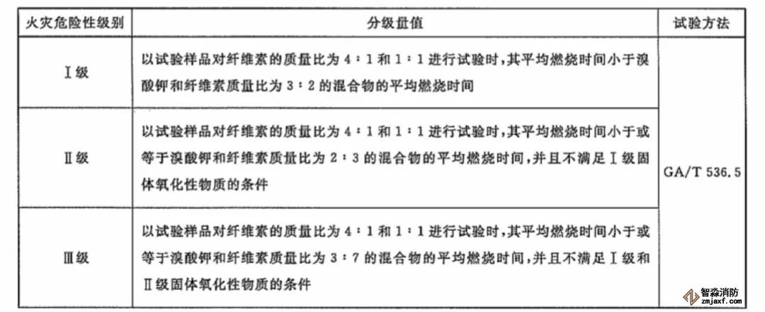 固體氧化性物質火災危險性分級方法見下表:
