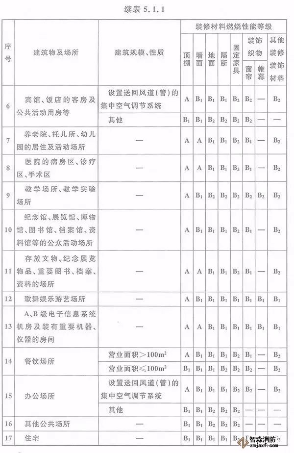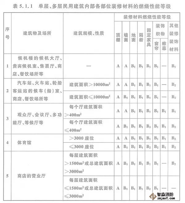 5.1.1 單層、多層民用建筑內(nèi)部各部位裝修材料的燃燒性能等級,不應低于本規(guī)范表5.1.1的規(guī)定。