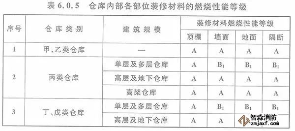 6.0.5 倉庫內(nèi)部各部位裝修材料的燃燒性能等級,不應低于本規(guī)范表6.0.5的規(guī)定。