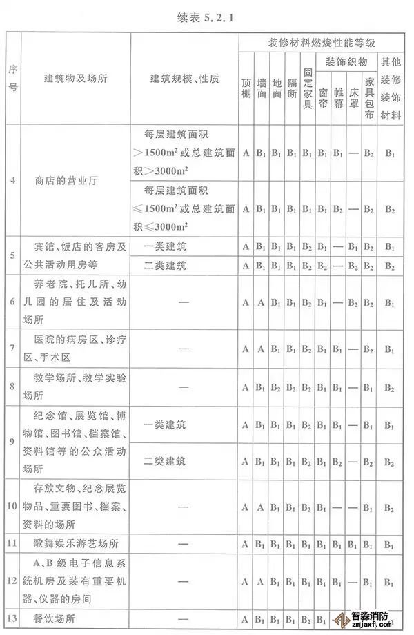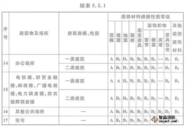 5.2.1 高層民用建筑內(nèi)部各部位裝修材料的燃燒性能等級,不應低于本規(guī)范表5.2.1的規(guī)定。