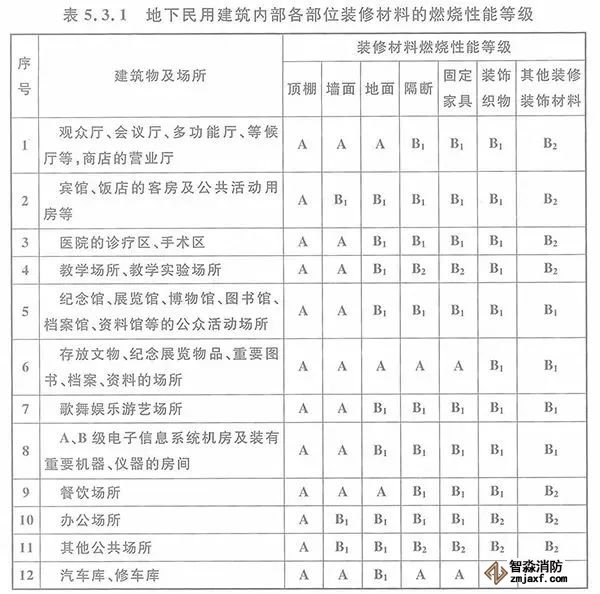 5.3.1 地下民用建筑內(nèi)部各部位裝修材料的燃燒性能等級,不應低于本規(guī)范表5.3.1的規(guī)定。