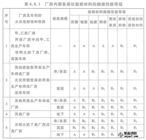 6.0.1 廠房內(nèi)部各部位裝修材料的燃燒性能等級,不應低于本規(guī)范表6.0.1的規(guī)定。