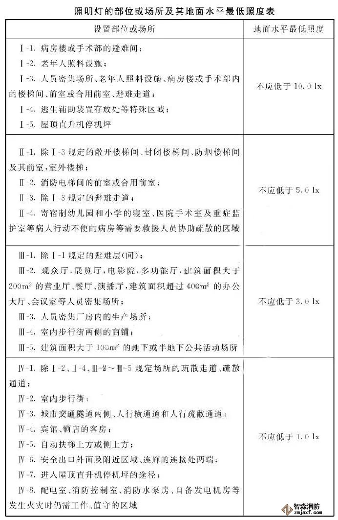 5、照明燈應采用多點、均勻布置方式,建、構筑物設置照明燈的部位或場所疏散路徑地面水平最低照度應符合下表的規定。