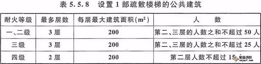 一、公共建筑內每個防火分區或一個防火分區的每個樓層,其安全出口的數量應經計算確定,且不應少于2個。設置1個安全出口或 1 部疏散樓梯的公共建筑應符合下列條件之一:(5.5.8