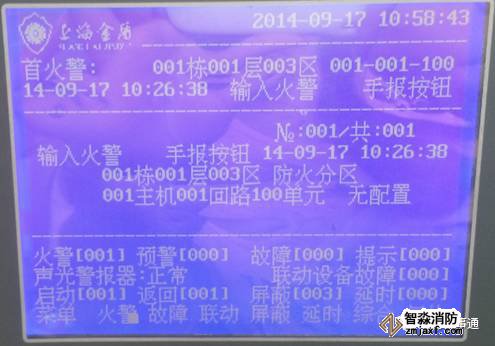答:從五個方面回答(1.報警類型-火警;2.報警部位-1棟1層3區(qū)防火分區(qū);3.報警時間-2014年9月17日10點26分38秒;4.報警原因-手動報警按鈕報火警;5.處理方法)注:需要從液晶顯示屏上把具體內(nèi)容代入并表達出來。