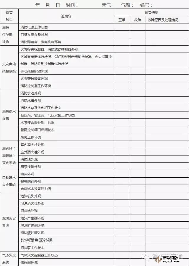 4、附表中各項目情況正常打“√”,存在問題或故障的打“×”;對發現的問題應及時處理,當場不能處置的要填報《建筑消防設施故障處理記錄》。