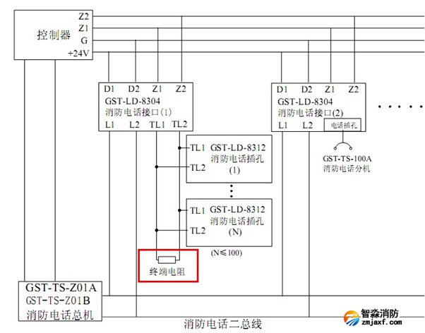 海灣GST-LD-8312消防電話插孔端子X(jué)T1電話線輸入端,端子X(jué)T2電話線輸出端,接下一個(gè)電話插孔,最末端電話插孔XT2接線端子接4.7kΩ終端電阻。