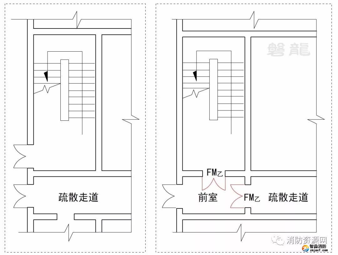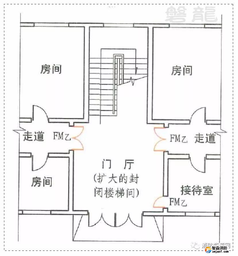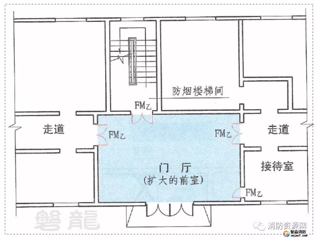 樓梯間的首層可將走道和門廳等包括在樓梯間前室內(nèi)形成擴(kuò)大的前室,但應(yīng)采用乙級(jí)防火門等與其他走道和房間分隔。