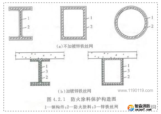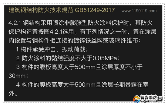 1、根據《建筑鋼結構防火技術規范4.2.1執規定,部分涂層內應設置與鋼構件相連接的鍍鋅鐵絲網或玻璃纖維布:
