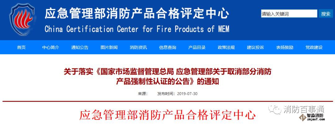 2019年7月29日,國家市場監督管理總局、應急管理部發布了《關于取消部分消防產品強制性認證的公告》(2019年第36號)(詳見附件),對消防水帶、噴水滅火產品等十三類消防產品(含部分火災報警產品)取消強制性產品認證。為依法依規開展消防產品合格評定工作,現通知如下: