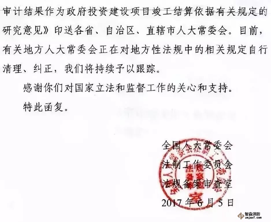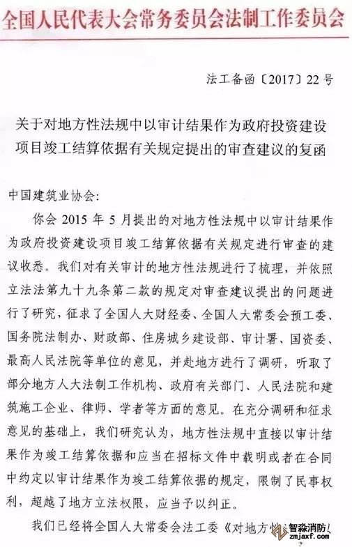 早在2017年全國(guó)人大常委會(huì)法工委復(fù)函《關(guān)于對(duì)地方性法規(guī)中以審計(jì)結(jié)果作為政府投資建設(shè)項(xiàng)目竣工結(jié)算依據(jù)有關(guān)規(guī)定提出的審查建議的復(fù)函》。該復(fù)函提出: