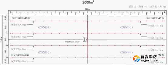 下圖是防火分區(qū)2000m2,使用FANFARE-2000探測主機,分為4個探測區(qū)域(每區(qū)500m2),采樣孔保護面積25.2m2的管路設(shè)計圖