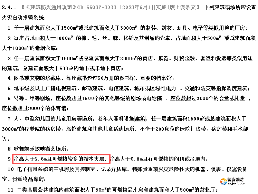 根據《建筑防火通用規范》GB 55037-2022在條文說明,也可以看出:如果遇到技術夾層,是這兩條未規定的其他建筑或場所,可以按照國家現行相關標準的要求或建筑的火災危險性等實際情況確定。此時就可以參照GB50016-2014(2018年版)的8.4.1條的9款來執行。