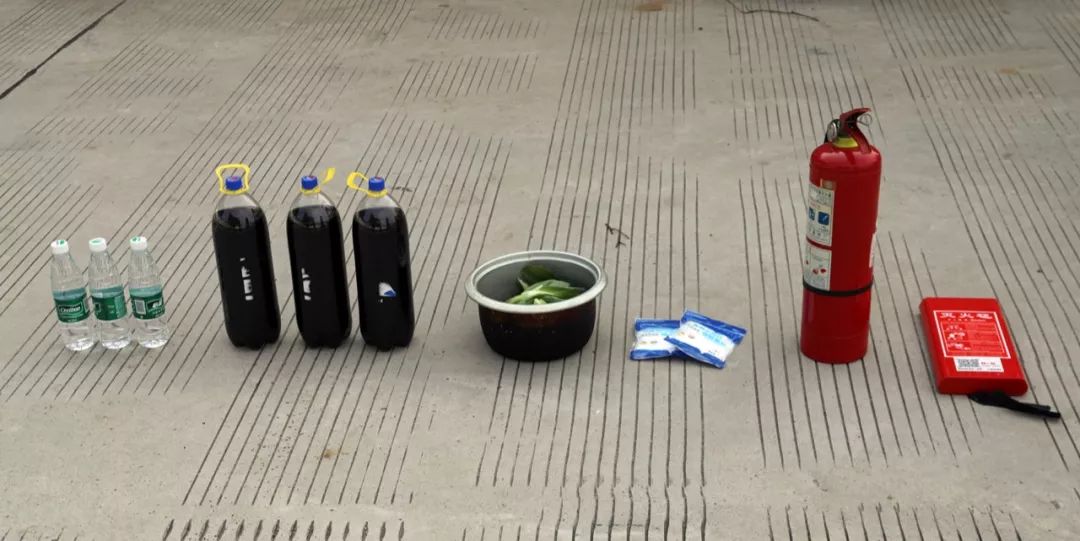 消防員準備了多種家庭中常見的簡易滅火用品:水、可樂、青菜、小蘇打、滅火毯以及鍋蓋,分別用它們進行油鍋滅火實驗。