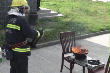 圖片中可以看到,可樂的效果竟然和水一樣,突然間的爆燃讓人始料不及。鐵鍋內的熱浪沖到了消防員的身上,如果不穿防護裝備的話,肯定會被燒傷。