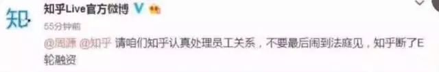 9日,知乎Live官方發微博稱,“請知乎認真處理員工關系,不要最后鬧到法庭見,知乎斷了E輪融資”,并艾特了知乎創始人周源。據此前該賬號發布的消息顯示,該離職員工投訴對象為其直接領導孟珊。該員工稱,孟珊在知乎帶領只是市場Live微信生態期間,管理霸蠻,工作安排不公平。知乎方面表示,是知乎離職員工盜取了官方微博賬號密碼發送了該則消息。目前,該賬號發布的相關內容已被刪除。