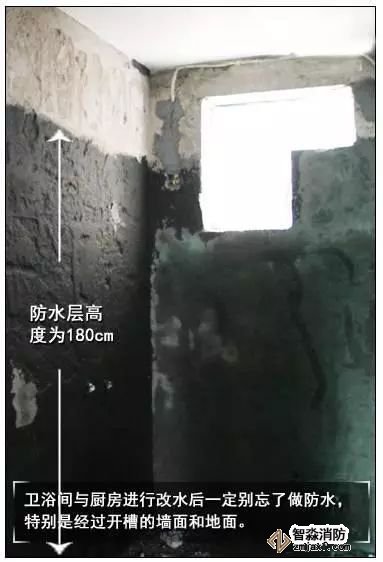 試壓完畢,繪制好給排水改造走向圖后,可以進行封槽。封槽后墻面與地面都必須做好防水,衛浴間墻面的防水層高度應該做到180cm,廚房墻面的防水層高度做到50cm,做好墻面和地面的防水層,以防日后出現“表面冒汗”的情況。