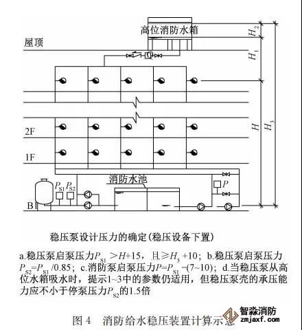 臨時高壓消防給水系統一般均應設置高位消防水箱(除符合規范規定可不設的情形外),且對其設置高度有一定要求。日本規范規定自動噴水滅火系統屋頂消防水箱最不利的最低供水壓力為0.15 MPa,美國、英國規范則要求0.10 MPa。我國1987年版和2006年版“建規”對比均沒有規定,只在條文中要求重力自流的消防水箱應設置在建筑的最高部位。1982年版《高層民用建筑設計規范》(以下簡稱“高規”)首次提出屋頂消防水箱應滿足最不利消火栓的靜水壓力,但沒有提出設計參數,1995年版“高規”做了具體規定。國標圖集98S205編制目的是為解決臨時高壓消防給水系統高位消防水箱設置高度滿足不了系統最不利點靜水壓力時應設增壓設施的要求,其為消防專用的增壓穩壓設備的主要功能只是火災初期時、消防主泵啟動前,確保具有足夠消防壓力的30 s儲水量進行初期火災撲救,直至消防主泵全負荷啟動運行。這里更多的還是強調增壓的概念,設備類似于氣壓供水,發揮主要作用的是氣壓水罐,穩壓水泵的作用是在3 min內,補足氣壓水罐內實際穩壓水容積。利用氣壓水罐所設定的P1、P2、PS1和PS2運行壓力來控制穩壓泵運行工況。P1為根據計算求得消火栓系統或自動噴水滅火系統中最不利點所需的消防壓力作為氣壓水罐的充氣壓力。平時管道系統如有滲漏泄壓等情況,控制穩壓水泵不斷補水穩壓,在PS1、PS2(啟動-停止)反復運行,一旦有火情,管道系統大量缺水,造成PS1下降(PS1→P2),降至P2時,立即啟動消防主泵。