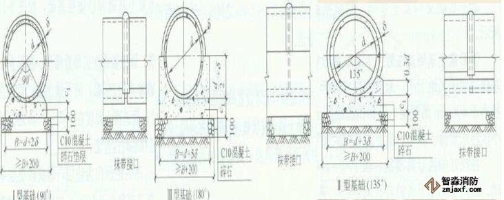 混凝土帶形基礎(chǔ)楚沿管道全長鋪設(shè)的基礎(chǔ),分為90、135、180的管座形式。
