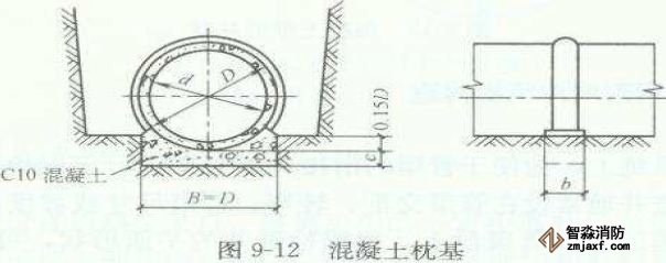 混凝土枕基是只在管道接口處才設(shè)置的管道局部基礎(chǔ),如圖9-12所示。通常在管道接口下用C1O混凝土做成枕狀墊塊,墊塊常采用900或1350管座。這種基礎(chǔ)適用于干燥土壤中的雨水管道及不太重要的污水支管,常與砂土基礎(chǔ)聯(lián)合使用。