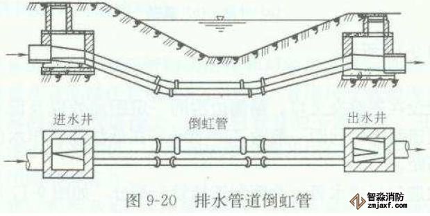 排水管道遇到河流、洼地、或地下構(gòu)筑物等障礙物時,不能按原有的坡度埋設(shè),而是按凹的折線方式從障礙物下通過,這種管道稱為倒虹管。它由進水井、下行管、平行管、上行管和出水井組成。