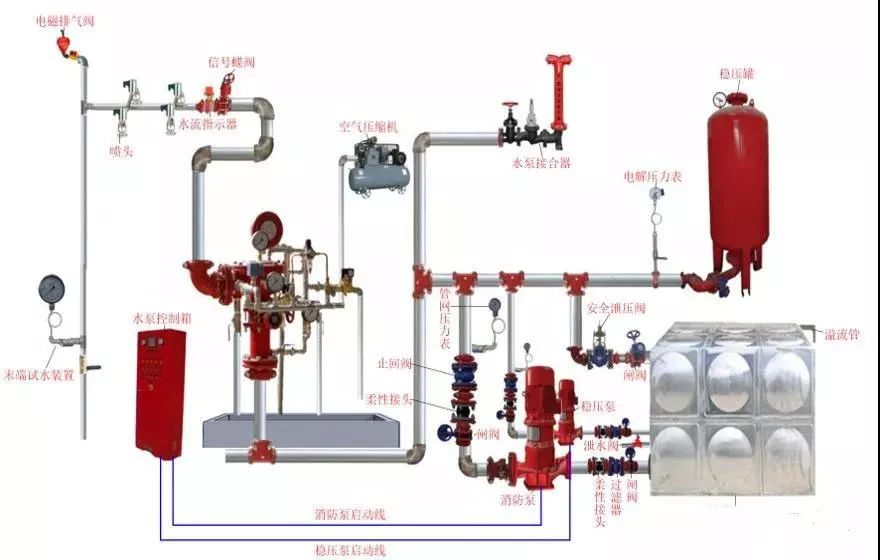 6、 預作用系統(tǒng)在準工作狀態(tài)時配水管道內(nèi)不充水,由火災自動報警器自動開啟預作用閥后,轉(zhuǎn)換為濕式系統(tǒng),預作用系統(tǒng)由閉式噴頭、預作用閥組、充氣設備(不是必須有)、水流報警裝置、供水設施及供水配水管道等組成。