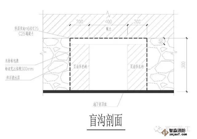 5、在地下室周邊設置與場地內盲溝相連的排水通道,最終將水排入城市雨
