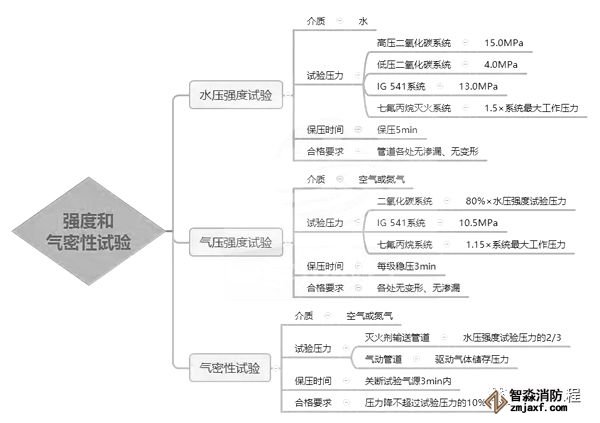1.滅火劑輸送管道安裝完畢后,應(yīng)進(jìn)行強(qiáng)度試驗(yàn)和氣壓嚴(yán)密性試驗(yàn),并合格。