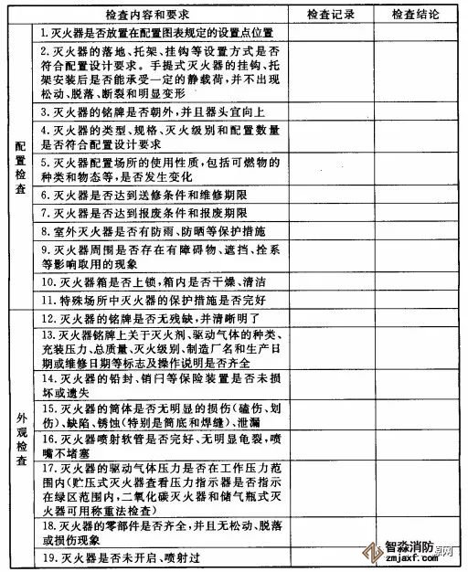 根據(jù)GB50444要求,滅火器的配置、外觀等至少每月檢查一次;對(duì)于候車(機(jī)、船)室、歌舞娛樂放映游藝等人員密集的公共場所,以及堆場、罐區(qū)、石油化工裝置區(qū)、加油站、鍋爐房、地下室等場所,至少每半月檢查一次,基本檢查內(nèi)容及要求如下: